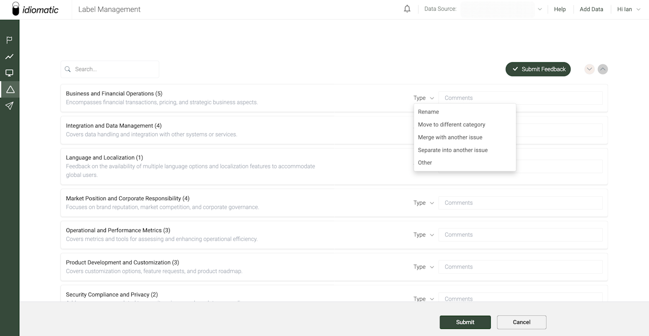 Custom Taxonomy: Idiomatic creates a tailored hierarchy of labels based on your data, organizing feedback into broad Categories and specific Issues. This structure helps track and analyze customer feedback effectively.